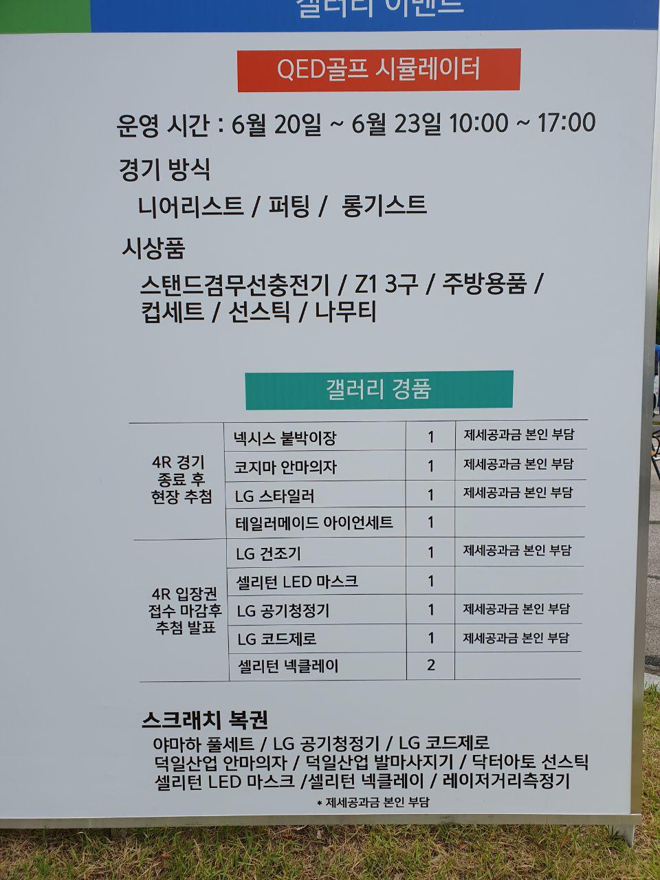 대회 종료 후 우승자가 추첨을 통해서는 넥시스 붙받이장, 코지마 안마의자, LG 스타일러, 테일러 메이드 아이언 세트를 드립니다.