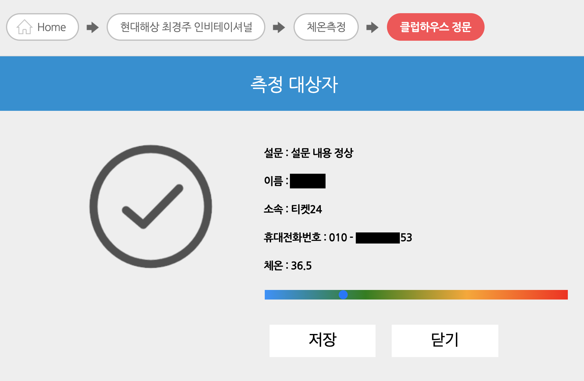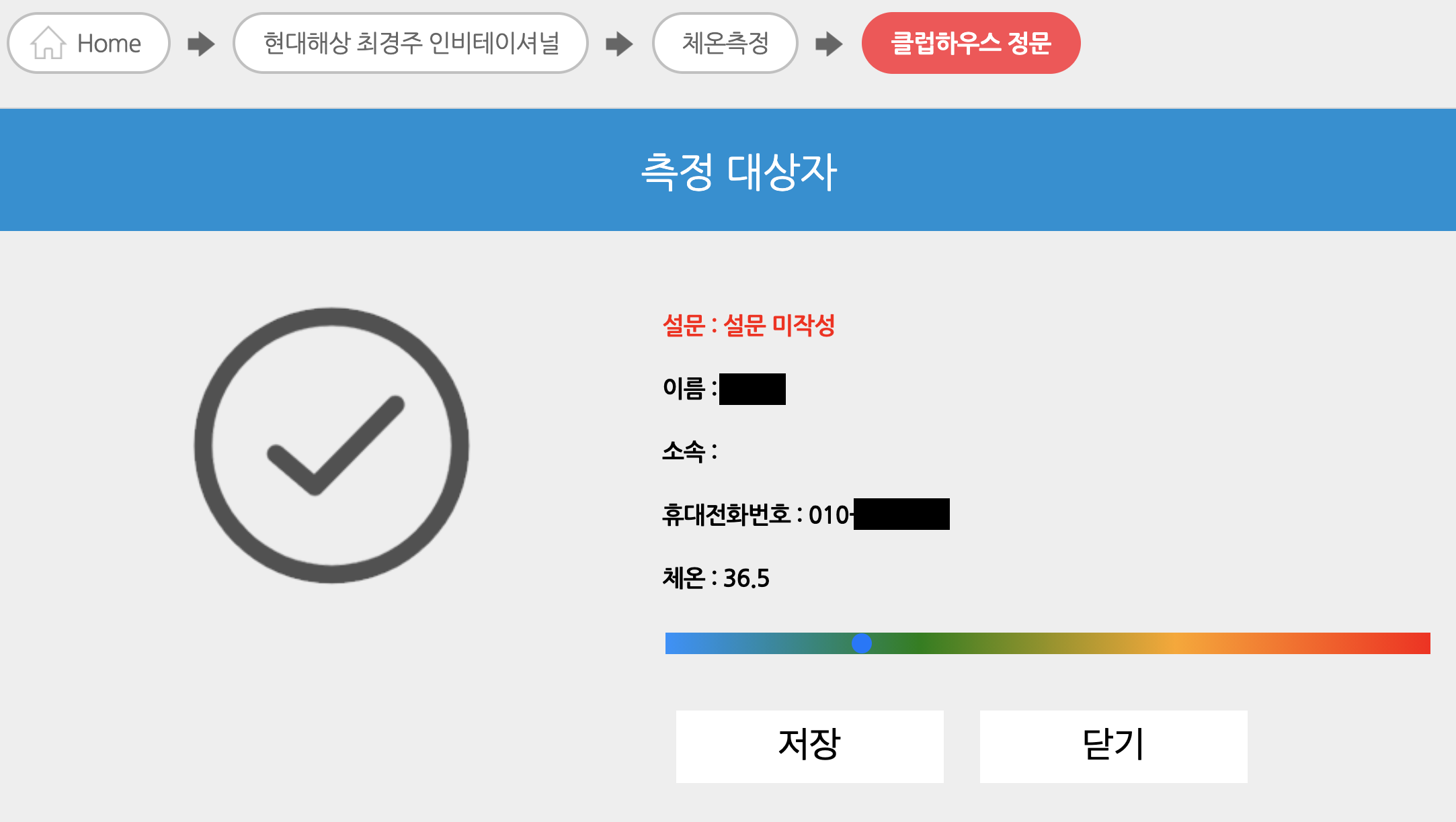 이 버튼을 눌러서 매일 매일 문진표를 작성하고 저장하면 됩니다.