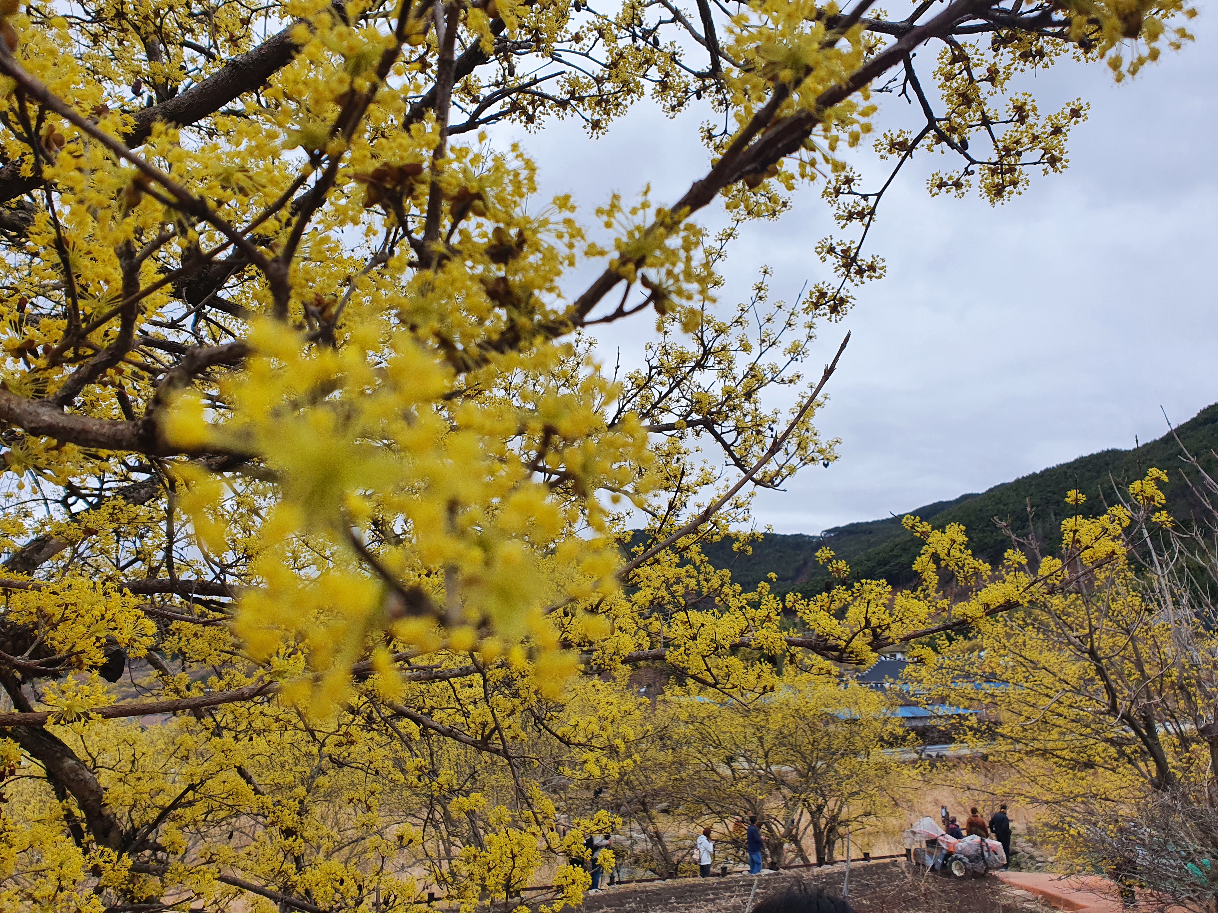 노란 산수유꽃이 만개한 마을에서 봄의 정취를 느낄 수 있습니다.