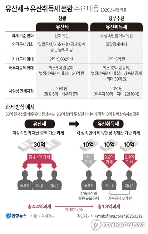 이번 개편에서는 상속받은 사람 기준으로 세금을 부과하는 "유산취득세 방식"으로 전환됩니다.