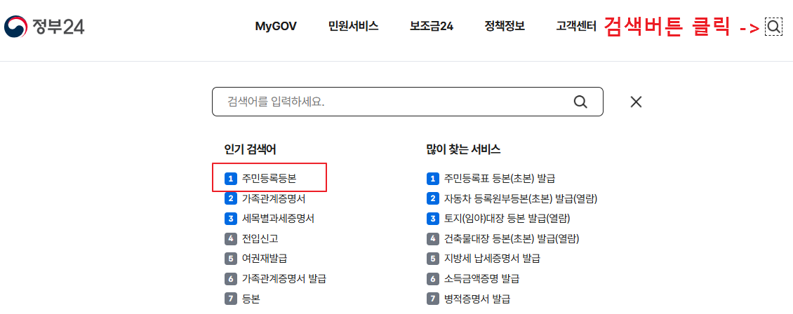 3. 검색창에 주민등록표를 검색하거나 인기검색어에서 '주민등록등본'을 선택합니다.