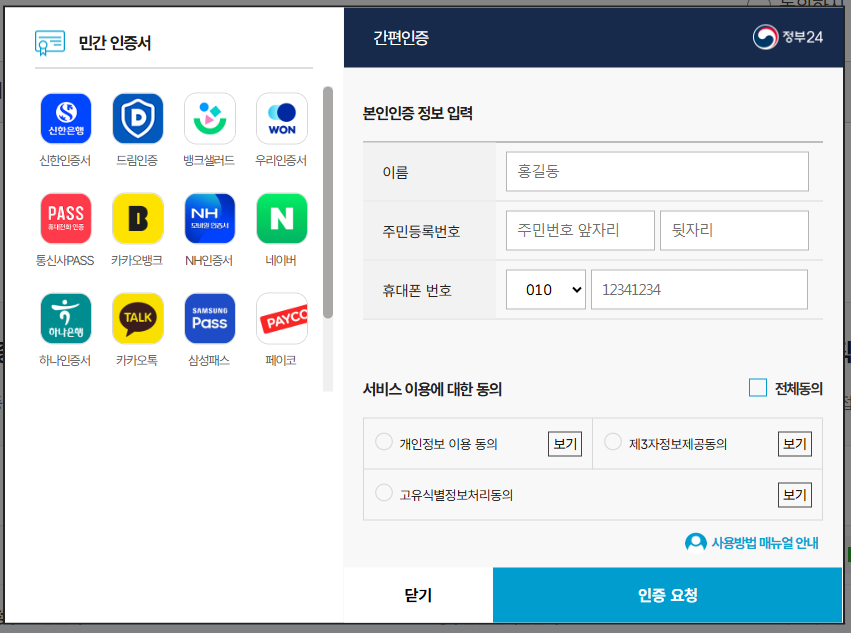 본인이 사용하는 간편인증을 선택하고 인증을 완료합니다.