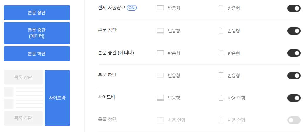 또한, 반응형 광고를 필수로 사용하여 다양한 기기 환경에서 광고가 깨지지 않고 최적의 형태로 노출되도록 설정해야 합니다.