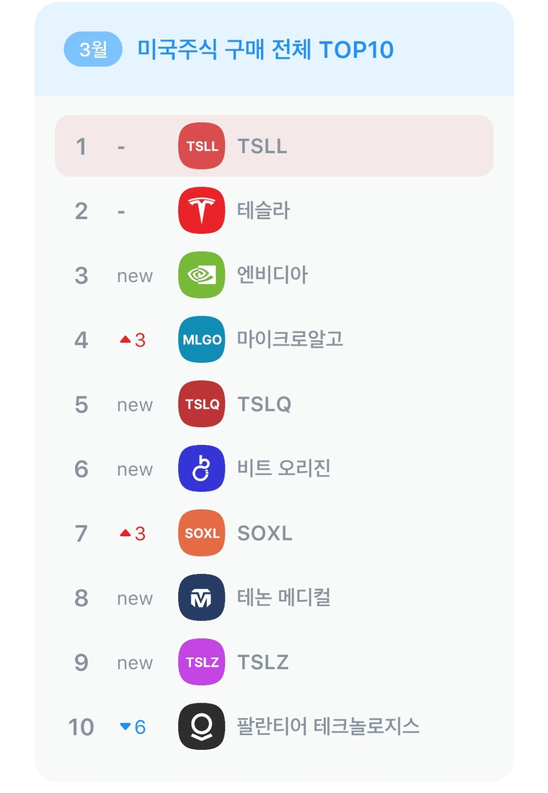 3월 한 달간 국내 투자자들이 가장 많이 순매수한 미국 종목은 다음과 같습니다: