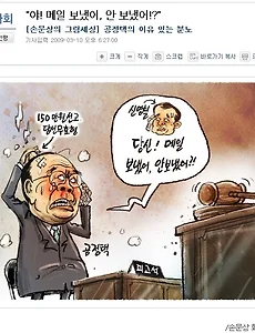 삐딱한 뉴스165 이번엔 중국관광객을 위해 4대강 사업을 하냐? 이 정부의 결론은 하나인가 보다. 일자리 창출을 위해서도 4대강 사업. 경기 부양을 위해서도 4대강 사업. 중국 관광객 유치를 위해서도 4대강 사업이다. 이러다가 곧 한반도 대운하로 이어질 것이다. 중국 관광객을 위한 4대강은 또 무슨 야그일까? 이명박 대통령의 최측근 박영준 국무총리실 국무차장이 10일 4대강 살리기는 문화, 환경사업으로서 중국 등 외국 관광객들의 대규모 유치를 위해서라도 반드시 성공해야 한다고 강조했다. 박 국무차장은 이날 기자간담회에서 “통상 1만달러 이상이면 해외여행을 한다고 보는데, 2년 이내에 중국에서 소득수준 1만달러를 넘는 사람이 1억명이 된다”면서 “그중 10%만 유치해도 1000만 관광객이지만 국내에는 이들을 유치할 수 있는 인프라가 전혀 없다”고 지적했다. 이어 “4대.. 2009. 3. 11. 신영철 대법관과 공정택 교육감은 친한 사이??? 만평 하나가 웃음 짓게 한다. 프레시안에 소개된 "손문상님의 그림세상"이다. 오늘 간만에 속시원한 소식을 접했는데 바로 공정택 교육감의 당선무효형 판결이다. 지난 교육감 선거때부터 공정택 이사람 정말로 마음에 안들었다. 당선 후에 일제고사 실시 강행 등 MB 코드에 맞는 교육정책을 팍팍 피곤 했었는데 이번에 다행히도 유죄 판결을 받았다. 물론 항소를 할 것이라 생각하지만, 항소를 하면서 시간을 질질 끌 것이라 생각하지만 그래도 무죄 판결 받은 것 보단 백배 낫다. [출처 : 프레시안 ] 2009. 3. 10. 우리나라에 더이상 노무현은 없다. [사진출처 : 한겨레신문] 누가 뭐라고 해도 그가 좋았다. 지금 MB와 비교해 보면 그의 가치가 더욱 더 빛날 것이다. 하지만 100일 후면 이제 우리나라에서 더이상 제2의 노무현을 기대하긴 어려울 것 같다. 여야가 합의를 했다고 하지만 어쨌든 100일 후엔 표결을 해야 하고 그러면 당연히 미디어법이 통과될 것이다. 민주당이 논의기구를 제안했고 한나라당이 받아들였지만 그동안 되지 않았던 논의가 지금이라고 될 것인가 말이다. 딱 100일만 싸움을 연장한 것 밖에 안된다. 미디어법이 통과되면 막강한 조중동이 TV방송을 하게 된다. TV 뉴스를 하게 되고 라디어를 틀게 될 것이다. 그럼 보수진영의 목소리를 24시간 내내 전달하고 국민을 현혹하고 그들만의 세상으로 우리를 인도하기 위해 엄청난 노력을 할 것이 뻔.. 2009. 3. 3. '아륀지' 한마디에 영어 과외비 증가 아무래도 영어와 관련된 사업을 해야 할 듯 하다. MB 정부는 툭하면 영어와 관련된 정책을 내 놓는데 결과적으로 서민들의 영어 사교육비를 엄청 증가시키는 결과만 나왔다. [그림 출처 : 한겨레신문] 학생 1인당 월 평균 사교육비를 과목별로 살펴보면 영어가 7만6천원으로 2007년보다 11.8% 늘어 증가폭이 가장 컸다. 영어 사교육비가 증가한 데는 이명박 정부의 영어교육 강화 정책이 큰 영향을 끼쳤다는 분석이다. 정부 출범 초기 ‘아륀지 정부’라는 신조어를 만들어 낸 영어 몰입교육 논란과 ‘영어로 하는 영어수업’, 서울 국제중 설립 등으로 영어의 중요성은 더욱 강조됐고, 교육과학기술부는 초등 영어 수업시간 확대, 말하기·쓰기 위주의 새로운 영어능력시험 도입 등 영어교육 강화 정책들을 잇따라 내놨다. 교과.. 2009. 2. 28. 이젠 법원도 정권의 시녀 !!! 검찰에 이어 법원도 정권의 눈치를 보는 신세가 되었다. 오늘 아침 한겨레신문에 단독보도가 되었지만 신문기사를 보면서 참으로 한심했다. 허만 서울중앙지법 수석부장판사(현 서울고법 부장판사)는 지난해 6~7월 즉결심판에 회부되거나 구속영장이 청구된 촛불집회 사건 관련자들에 대해 형량을 높이고 구속영장 기각 사유를 바꿀 것을 판사들에게 요구했다. 당시 서울중앙지법에 있던 한 판사는 이날 “허 수석부장판사가 단독판사들에게 촛불집회에 참가한 혐의(집회 및 시위에 관한 법률 등)로 즉심에 회부된 피고인들에게 벌금형이 아닌 경찰서 유치장에 가두는 구류형을 선고하라고 요구했다”고 말했다. 경찰은 촛불집회가 한창이던 6~7월 단순 참가자들 일부를 즉결심판에 넘겼으며, 당시 서울중앙지법엔 하루 10명 안팎의 촛불집회 관련.. 2009. 2. 25. 이해안되는 미네르바 구속 사유 미네르바가 결국 구속됐다. 미네르바 체포 후에 구속요건이 된다 안된다로 각종 언론이 뜨거웠다. 보수신문은 전기통신기본법을 위반했다는 사실을 집중 부각해서 구속의 당위성을 외쳤고 진보신문은 인터넷의 표현의 자유를 언급하여 구속의 부당함을 알렸다. 그러나, 이 나라의 법원은 결국 미네르바를 구속했다. 서울중앙지법 김용상 영장전담판사는 "범죄사실에 대한 소명이 있고 외환시장 및 국가 신인도에 영향을 미친 사안으로, 사안의 성격 및 중대성에 비춰 구속수사의 필요성이 있다"고 영장 발부 사유를 밝혔다. 법원이 밝힌 미네르바의 구속사유 중 중요 이유는 바로 국가신인도에 영향을 미쳤다는 것이다. 즉, 미네르바가 인터넷에 올린 글 한편(검찰은 그동안 미네르바의 여러 글 중에서 7월30일에 올린 한 편을 문제삼았었다)이.. 2009. 1. 10. 2중대, 2소대 !!! 국회는 아직도 군사독재 시절인가? "선진당은 여당의 2중대 