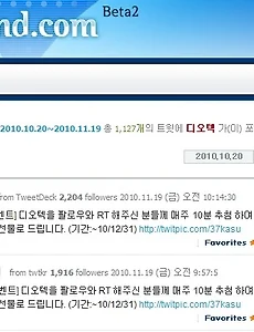 IT산책352 마음에 드는 트위터친구를 만드는 가장 좋은 방법 트위터는 Following과 Follower 그리고 tweet으로 구성됩니다. 아시는 것처럼 Following는 내가 소식을 듣는 사람들이고, Follower는 내 말을 들어주는 사람들입니다. Following은 내가 상대방을 follow하면 되므로 마음만 먹으면 손쉽게 그 숫자를 늘일 수 있지만 무작정 Follow 버튼을 눌러서 Following을 만들게 되면 나와 뜻이 맞지 않거나, 읽고 싶지 않은 글들로 타임라인이 가득차게 될 수도 있습니다. 나와 생각이 다른 글도 읽고 배워야겠지만 기본적으로 나와 생각과 뜻이 비슷한 사람의 글을 읽고 공감하는 것이 더 우선이겠죠. 트위터에서 나와 비슷한 성향(정치, 종교, 사회적)을 찾는 것은 그리 쉬운 것은 아닙니다. 우선 Following을 맺은 후, 그 사람.. 2010. 11. 29. 정부기관 트위터 운영 주간순위, 2010년 11월 29일 2010년 11월 29일자 정부기관 트위터 운영 주간 순위입니다. 온라인버즈 분석 서비스 및 소셜 모니터링 서비스를 제공하는 BuzzInsight에서 지난 일주일동안 정부기관 트위터의 운영상황을 조사한 후, 이를 BPTI(Buzzinsight Power Twitter Index)로 환산하여 매긴 순위입니다. 이번주는 국토해양부가 BTPI 지수 918.50의 높은 점수로 1위를 차지하였습니다. 정부기관명 트위터계정 BTPI 국토해양부 @Korea_Land 918.50 청와대 @BluehouseKorea 572.60 국무총리실 @PrimeMinisterKR 404.00 농림수산식품부 @mifaff 359.70 국방부 @ROK_MND 358.40 보건복지부 @mohwpr 247.90 기상청 @kma_Weath.. 2010. 11. 29. No.1 트위터 검색서비스 트윗트렌드 소개 - 1 소셜 네트워크의 시대입니다. 이런 말이 눈에 팍 들어옵니다. 블로그는 퍼블리싱을 위해 트위터는 스트림을 위해 페이스북은 네트워킹을 위해 한다. 트위터는 Stream을 위해 사용한다고 생각하면 말 그대로 물 흐르듯 계속해서 TimeLine에 수많이 트윗들이 흘러갑니다. 이럴 때 필요한 것이 Search(검색)입니다. 트위터나 각종 어플에서 트윗의 실시간 검색은 제공하지만 정작 어제의 트윗, 일주일 전의 트윗, 과거 어떤 시점의 이야기 등은 이러한 검색으로 찾아낼 수 없습니다. 이런 요구는 즈넛의 버즈인사이트(BuzzInsight)에서 만든 트위터 검색서비스인 트윗트렌드(Tweetrend)을 해결할 수 있습니다. 트윗트렌드의 여러 기능을 살펴보겠습니다. 트윗트렌드의 첫 페이지입니다. 현재 트윗트렌드 Beta.. 2010. 11. 23. 정부기관 트위터 운영 주간순위, 2010년 11월 22일 2010년 11월 22일자 정부기관 트위터 운영 주간 순위입니다. 온라인버즈 분석 서비스 및 소셜 모니터링 서비스를 제공하는 BuzzInsight에서 지난 일주일동안 정부기관 트위터의 운영상황을 조사한 후, 이를 BPTI(Buzzinsight Power Twitter Index)로 환산하여 매긴 순위입니다. 이번주도 지난주에 이어서 청와대(@BluehouseKorea)가 1위를 차지하였습니다. 정부기관명 트위터계정 BTPI 청와대 @BluehouseKorea 358.70 농림수산식품부 @mifaff 320.80 국토해양부 @Korea_Land 256.40 기상청 @kma_Weather 170.70 국세청 @ntskorea 169.30 중소기업청 @bizinfo1357 89.90 기획재정부 @mosfkor.. 2010. 11. 22. 기업의 팔로우, RT 이벤트 과연 효과있을까? 트위터, 페이스북의 시대입니다. 각설하고 본론으로 들어가겠습니다. 요즘 기업에서 트위터 계정을 많이 생성하고 팔로우를 늘리고자 여러가지 이벤트를 진행하고 있습니다. 주로, 팔로우를 하게 되면 추첨에서 소정의 경품을 주는 것이 대부분입니다. 그런 경품을 목적으로 기업의 팔로우 이벤트만 찾아서 활동하는 트위터 유저도 있을 것입니다. 그럼 이렇게 반짝 이벤트가 끝난 후에 트위터 유저들이 지속적으로 해당 기업에 관심을 갖게 되는가? 이 부분이 기업의 입장에서 고민이 될 것입니다. 기업트위터계정에 팔로우를 했기 때문에 기업이 내보내는 홍보/공지/이벤트성 트윗에는 지속적으로 노출이 될 것이지만 트위터 유저들이 그것에 반응을 할지는 미지수입니다. 오늘 아침 한가지 재미있는 사실을 하나 발견하였습니다. 우리 팀원(@l.. 2010. 11. 19. 정부기관 트위터운영 주간 순위, 2010년 11월 15일 2010년 11월 15일자 정부기관 트위터 운영 주간 순위입니다. 온라인버즈 분석 서비스 및 소셜 모니터링 서비스를 제공하는 BuzzInsight에서 지난 일주일동안 정부기관 트위터의 운영상황을 조사한 후, 이를 BPTI(Buzzinsight Power Twitter Index)로 환산하여 매긴 순위입니다. 이번 주는 청와대(@BluehouseKorea)가 1위를 차지하였습니다. 지난주에 있었던 G20 Seoul Summit의 상황을 열심히 전송한 것이 가장 큰 이유로 생각됩니다. 정부기관명 트위터계정 BTPI 청와대 @BluehouseKorea 459.60 국토해양부 @Korea_Land 389.20 보건복지부 @mohwpr 315.10 기상청 @kma_Weather 309.60 농림수산식품부 @mif.. 2010. 11. 15. Daum의 소셜웹검색보다 훌륭한 트위터검색서비스 요즘 TV에서 재미있는 광고가 하나 보입니다. 바로 Daum의 소셜웹검색 광고죠. 맘에 드는 여학생의 트위터를 바로바로 검색해서 팔뚝이 굵은 남자를 좋아하는 것을 알고 실망하는 내용입니다. ^^; 트위터가 확산되면서 다음, 네이버 등의 포탈에서 '실시간검색'이라는 메뉴로 트위터검색 서비스를 제공하고 있습니다. 네이버의 경우는 사용자가 입력한 검색어를 기준으로 트위터에서 실시간으로 받아오는 트윗을 단순 필터링하여 제공